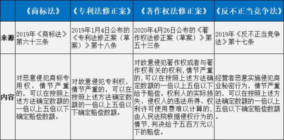 事实上,在2013年修改通过的《商标法》第六十三条首次明确规定了商标侵权行为中惩罚性赔偿;2019年1月4日,全国人大常委会公布的《专利法修正案(草案)》中,也包含了惩罚性赔偿的条文规定;2019年《反不正当竞争法》第十七条规定了惩罚性赔偿;2020年4月26日全国人大常委会公布的《著作权法修正案(草案)征求意见》第五十三条规定了惩罚性赔偿。
