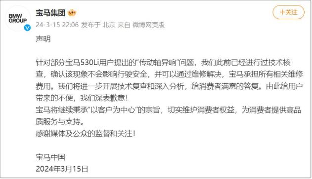 针对部分宝马530Li用户提出的“传动轴异响”问题,我们此前已经进行过技术核查,确认该现象不会影响行驶安全,并可以通过维修解决,宝马承担所有相关维修费用。我们将进一步开展技术复查和深入分析,给消费者满意的答复。由此给用户带来的不便,我们深表歉意!
