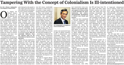 2019年9月12日,驻南非大使林松添在南主流媒体《星报》、《比陀新闻报》刊发署名文章《篡改“殖民主义”概念用心险恶》,对当地有人企图美化殖民主义概念并抹黑攻击中国对非投资合作等错误论调予以有力批驳。全文如下: