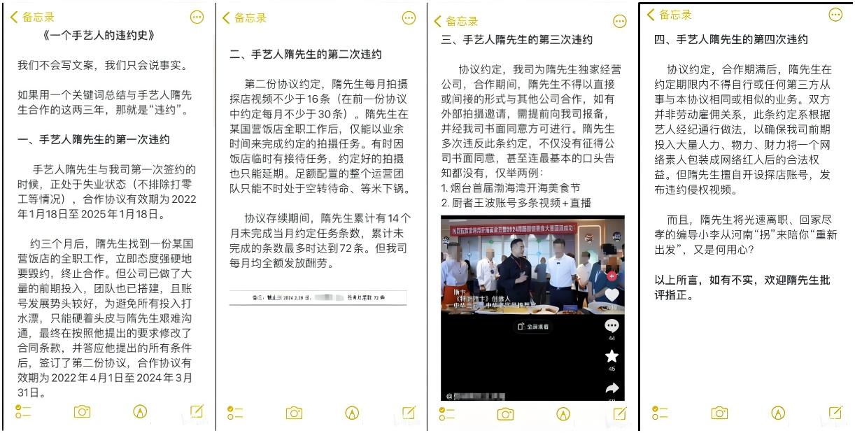 5月18日,“特厨隋卞”账号再度发布视频《一个手艺人的违约史》,文中提到,合作期间隋先生先后有4次违约行为,内容涉及未能按约定完成拍摄任务、以直接或间接的形式与其他公司合作、合作期满后违反竞业协议等方面。