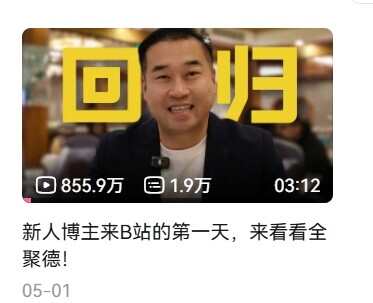 5月1日起,厨师隋坡通过账号“@特厨隋坡”发布视频《新人博主来B站的第一天,来看看全聚德!》,宣布“重新启动”。随着此前视频积累起的网络人气发生迁移,该账号粉丝数量迅速突破100万。