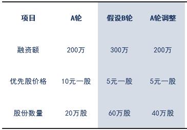 如果A轮融资200万元,按每股优先股10块钱的初始价格共发行A轮20万股优先股。在B轮融资时,优先股的发行价跌为每股5块钱,则根据完全棘轮条款的规定,A轮优先股的转换价格也调整为5元,则A轮投资人的20万优先股就可以转换为40万股普通股。