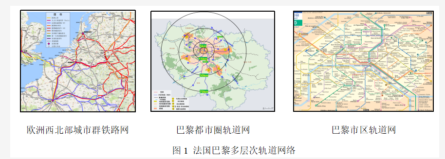 法国形成了以巴黎为中心,由高速铁路、普通铁路、市域(郊)铁路、地铁与有轨电车等组成的放射状多层次轨道交通系统。其中高速铁路和普通铁路主要服务于欧洲西北部城市群各市之间的联系、市域(郊)铁路主要服务于巴黎大都市圈的通勤联系、地铁和有轨电车服务于巴黎市内的交通联系。