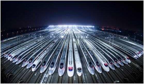 2007年12月22日,中国首列国产化时速300公里“和谐号”动车组列车竣工下线。2017年6月26日,具有完全自主知识产权、达到世界先进水平的中国标准动车组“复兴号”在京沪高铁两端的北京南站和上海虹桥站双向首发。到2017年底,中国铁路里程达到12.7万公里,高铁里程2.5万公里,占世界高铁总量的66.3%。