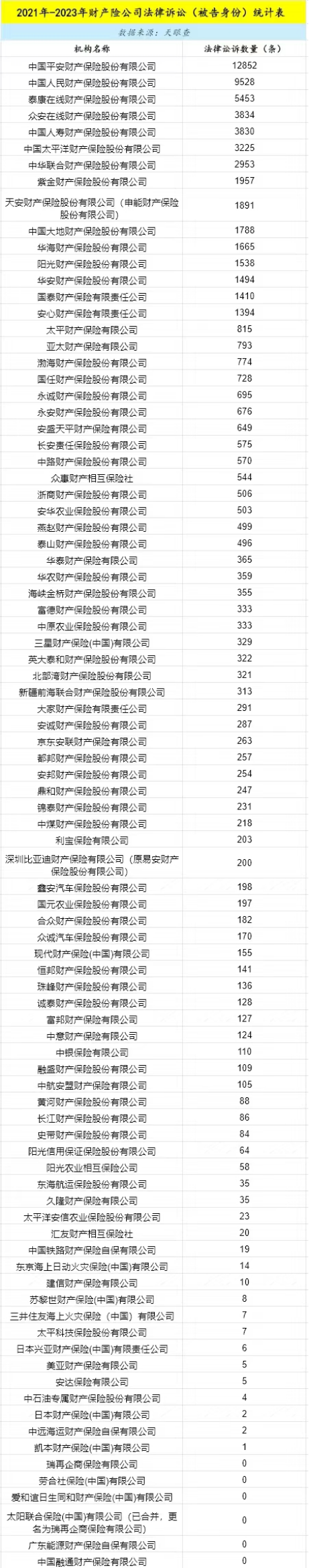 整体上,仅平安财险1家在三年内被诉案例超10000条,2家财产险公司被诉案例在5000-10000条区间,12家公司被诉案例在1000-5000条区间,22家公司被诉案例维持在百位数以下,6家公司(瑞再企商保险、劳合社保险(中国)、爱和谊日生同和财产保险(中国)、太阳联合保险(中国)、广东能源财险自保和融通财险)在三年时间内未牵涉被诉案例。