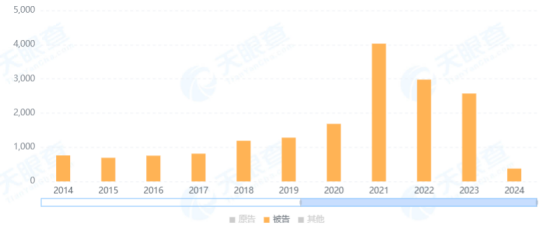 (人保财险近几年案件数目走势(被告),图源:天眼查)