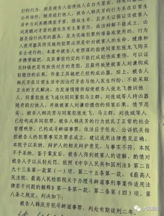 8月20日,大白新闻联系到了韩某某的代理律师——河南轨道律师事务所常伯阳律师。并拿到了河北省邢台市桥西区人民法院作出的(2016)冀0503刑初21-1号(韩某某案)判决书。