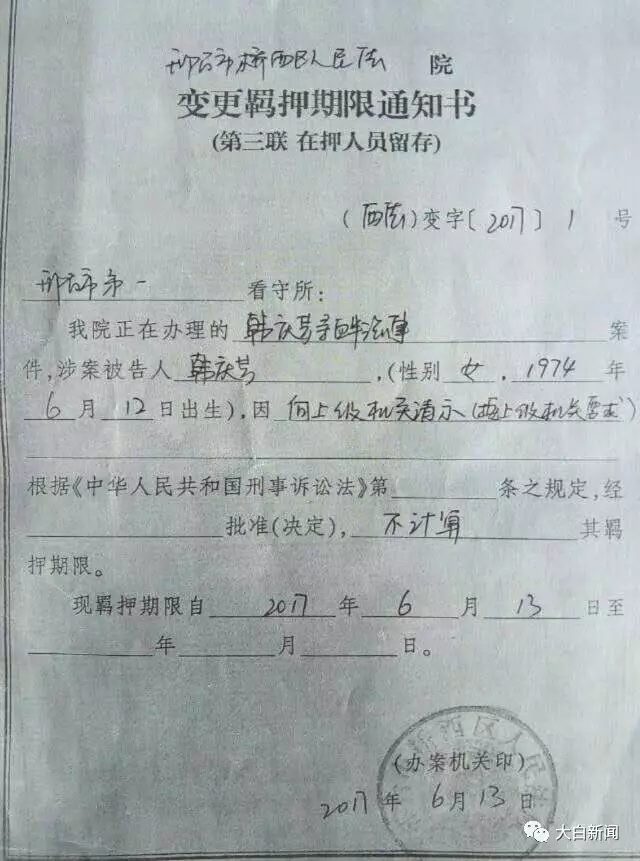 据了解,网传“邢台市桥西区人民法院变更羁押期限通知书”编号为“(西法)变字【2017】1号”,其出具时间为“2017年6月13日”,出具单位是“邢台市桥西区人民法院”。此外,通知书还显示,此通知是“第三联 在押人员留存”。