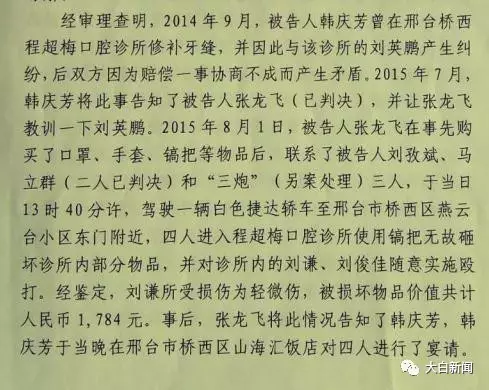判决书显示,“经审理查明,2014年9月,被告人韩某某曾在邢台桥西程超梅口腔诊所修补牙缝,并因此与该诊所的刘某某产生纠纷,后双方因为赔偿一事协商不成而产生矛盾。”