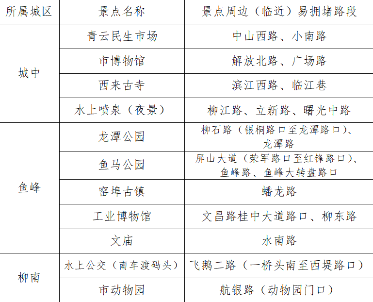 5月30日至6月2日的晚餐时段(18时—21时),城中辖区五星商圈(风情港)、新地王广场、城中万达广场,鱼峰辖区银泰城、窑埠古镇、万象城、荣军路口大润发超市,柳南辖区柳南万达广场,柳北辖区保利商业广场、柳北大润发、胜利烧烤城等周边路段,人车流量将较为密集,车辆通行将受到影响出现一定程度的车流缓行。