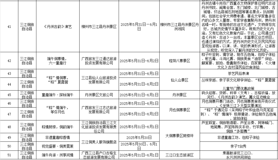 三江侗族自治县开展民族竞技“斗鸡”体验、童趣端午·探秘端午等活动。具体包括斗鸡游戏、码头迎客、古榕祈福、《丹洲古韵》演艺、篝火狂欢晚会等,让游客从视觉、听觉上以及游戏体验中深入了解三江的文化历史。