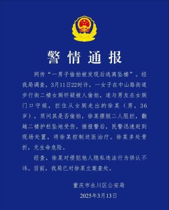 36岁男子在女厕所偷拍被发现后逃离坠楼