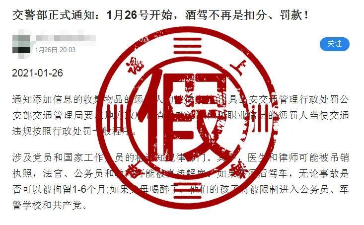 近日,有传言称,“1月26号开始,酒驾不再只是扣分、罚款,言下之意可能面临更多处罚。医生和律师可能被吊销执照;法官、公务员和教师可能被直接解雇;如果父母酒驾,孩子将被限制进入公务员系统、军警学校和入党。”