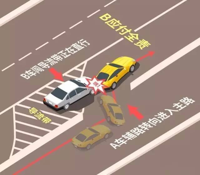在城市主干路上,一些并入主干路的辅路入口,都会有转向并入的导流带,在入口之前也会有相应的导流带,引导主路车辆避让前方入口车辆。而如果此时有车辆直行闯入导流带,与正在转向进入主路的辅路车辆发生事故,那么闯入导流带的车辆,是要负全责的。