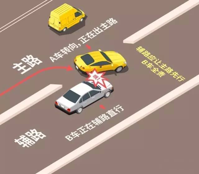 当主路车辆转入辅路时,辅路车辆即便是直行,也要让主路车辆先行。一旦发生交通事故,抢行的辅路车辆全责。