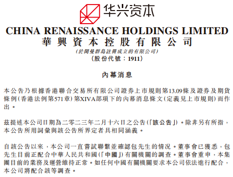 华兴资本控股2月26日晚间公告(来源:港交所)