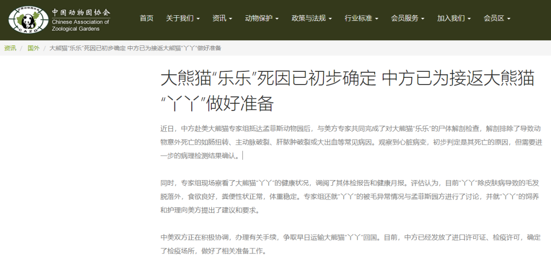 ● 近日,中方赴美大熊猫专家组抵达孟菲斯动物园后,与美方专家共同完成了对大熊猫“乐乐”的尸体解剖检查,观察到心脏病变,初步判定是其死亡的原因,但需要进一步的病理检测结果确认。此外,中美双方正在积极协调,办理有关手续,争取早日运输大熊猫“丫丫”回国。目前,中方已经发放了进口许可证、检疫许可,确定了检疫场所,做好了相关准备工作。