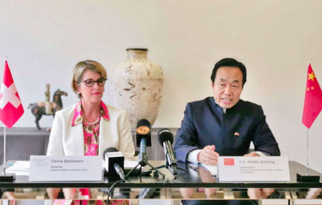 8月24日,中国流失文物移交仪式在瑞士首都伯尔尼举行。受国家文物局委托,中国驻瑞士大使王世廷(右)代表中国政府与瑞士联邦文化总局局长卡琳·巴赫曼女士共同出席,并签署交接协议。图片来自中国驻瑞士大使馆