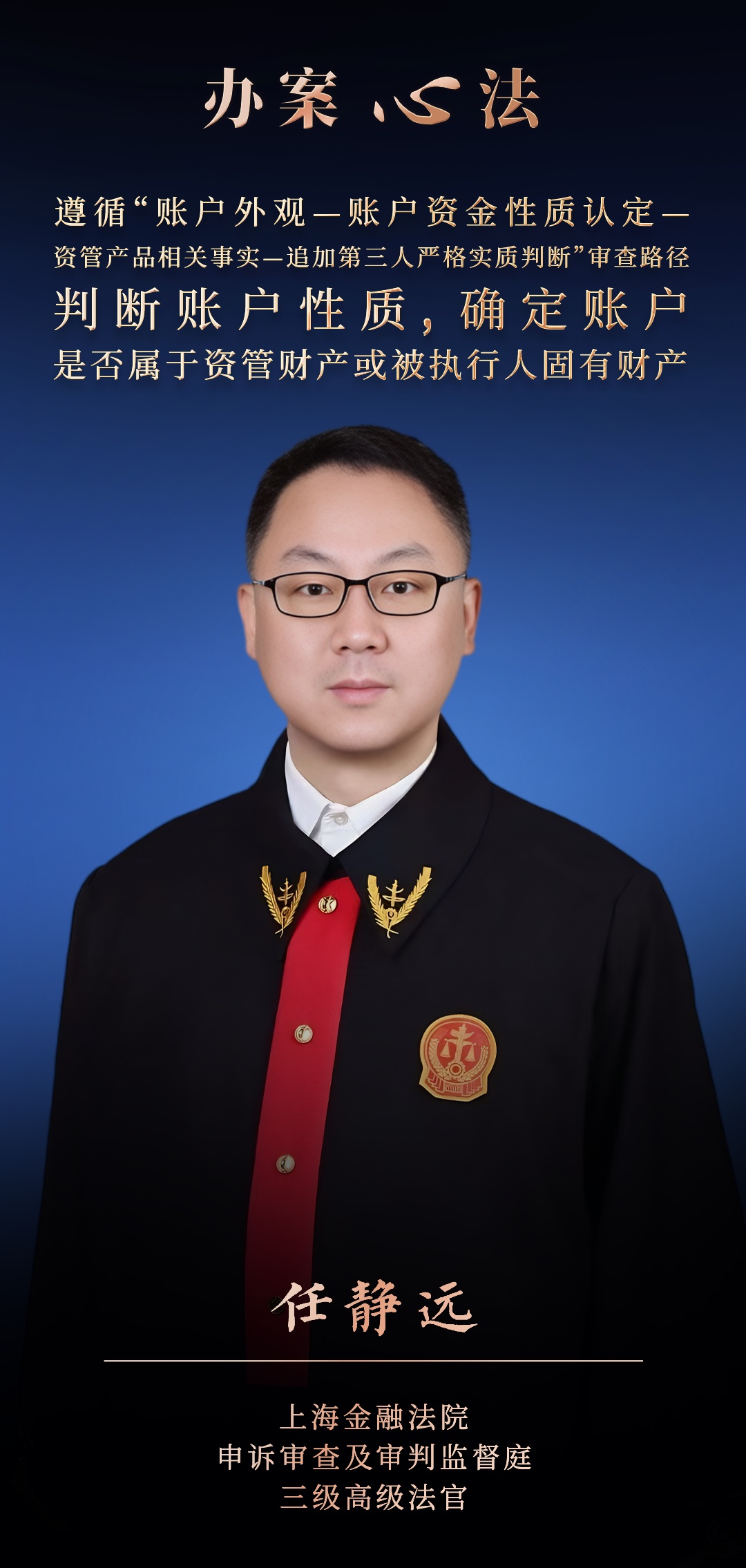 本期“办案心法”栏目“上海法院审判业务骨干”特别专题,邀请上海金融法院申诉审查及审判监督庭三级高级法官——任静远为我们讲解资管产品专项账户的性质认定及执行异议审查