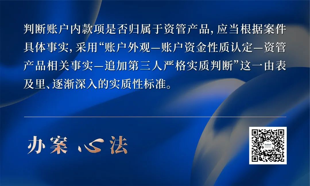 上述法理基础已经明确的情况下,应当如何判断账户内的款项归属于资管产品?结合审判实践中的具体情形,应当根据案件具体事实,采用“账户外观—账户资金性质认定—资管产品相关事实—追加第三人严格实质判断”这一由表及里、逐渐深入的实质性标准进行判断:
