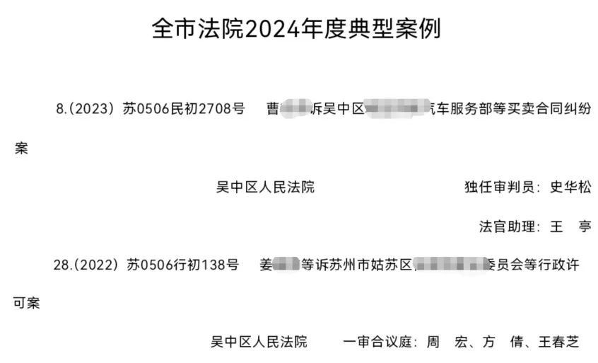 在全市法院2024年度典型案例评选活动中,我院审判委员会专职委员史华松审理的曹某某诉吴中区某汽车服务部等买卖合同纠纷案,度假区人民法庭庭长周宏审理的姜某某等诉苏州市姑苏区某单位等行政许可案2篇案例入选。
