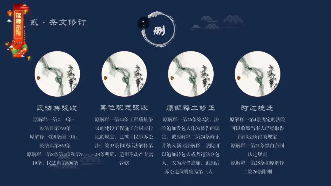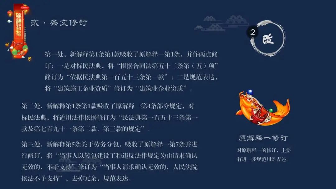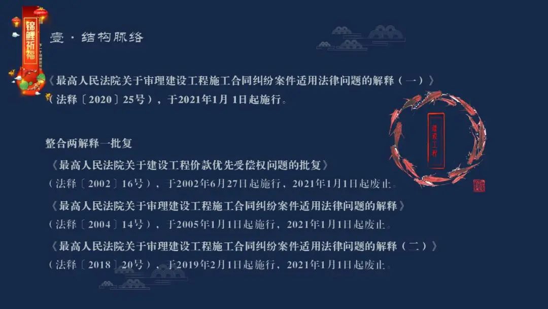 2021年元旦前夕,最高人民法院发送两批 “新年大礼包”,微信群、朋友圈持续刷屏。今天与大家分享的《关于审理建设工程施工合同纠纷案件适用法律问题的解释(一)》,是“大礼包”7件新的司法解释之一。我们从三个部分来了解:第一部分,宏观层面,了解新司法解释的结构脉络;第二部分,微观层面,准确理解重点条文增、删、改的内容与原因;第三部分,精神价值层面,洞悉建设工程相关规范的立法目的和法律适用的基本规律,我将与大家分享几条“锦鲤”,看清条文变化背后不变的精神价值。