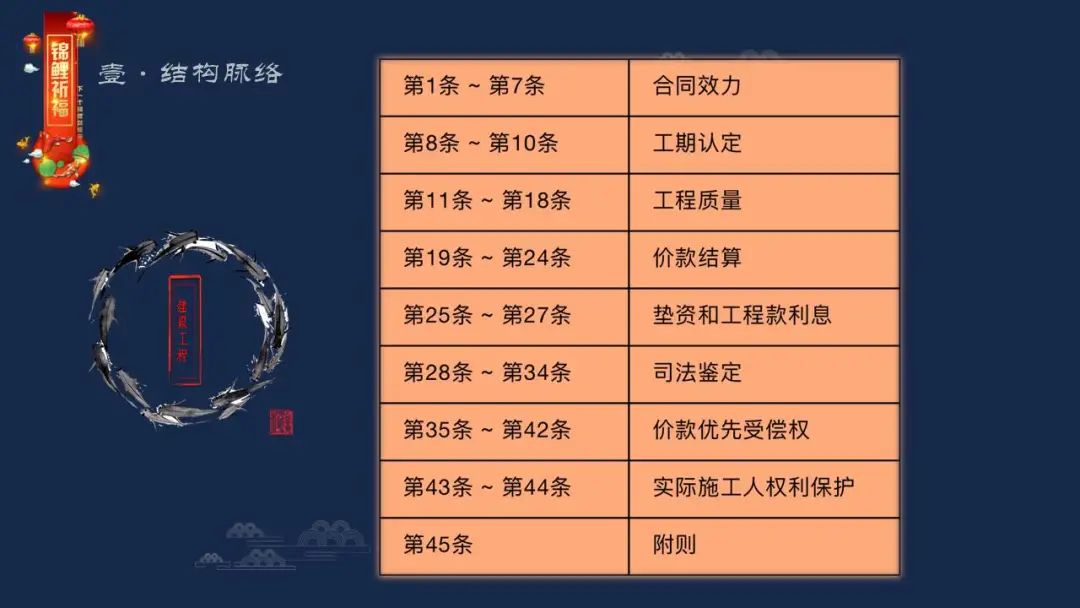 重点就是这一条,要先抓住,然后我们就开始逐条击破了吗?先别急。我建议,先给45个条文分分段,按专题来学习,效果更好。问题框架沿用了原建设工程司法解释(二)的结构:1-7条规定合同效力;8-11条规定工期;12-18条规定质量;19-24条规定结算;25-27条规定利息;28-34条规定鉴定;35-42条规定优先受偿权;43-44条规定实际施工人;45条是附则。