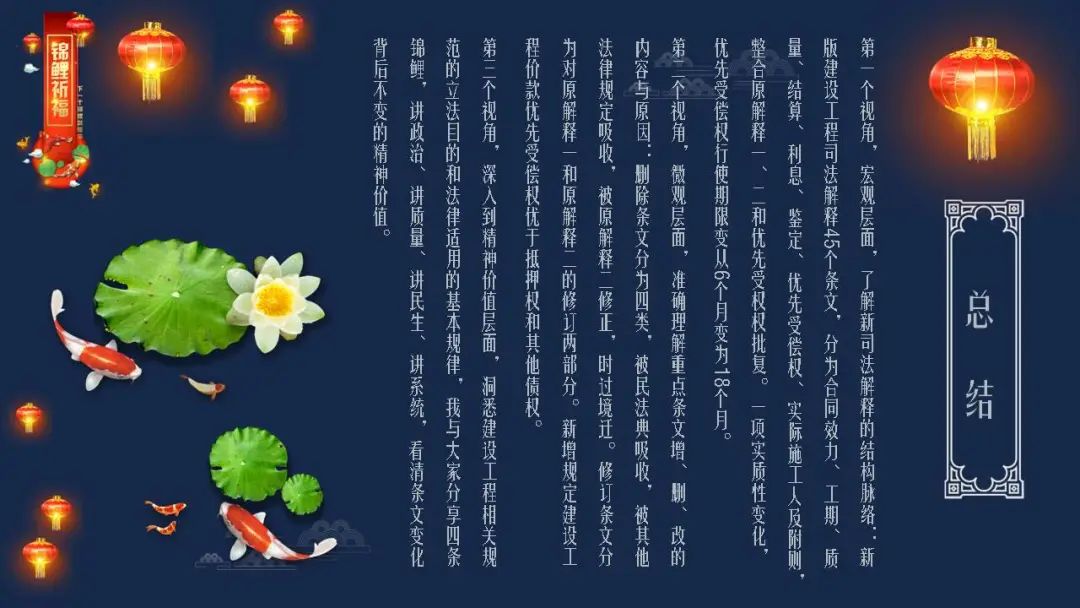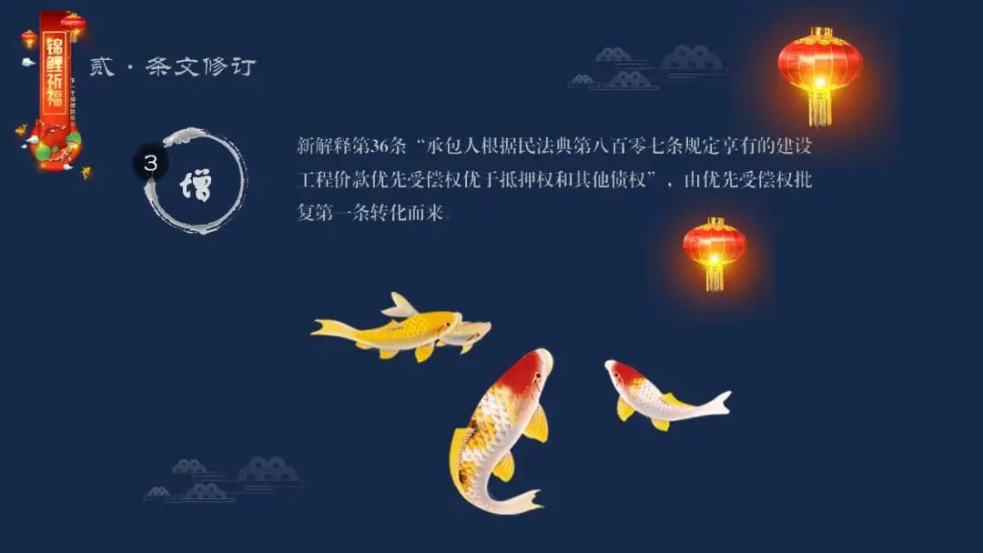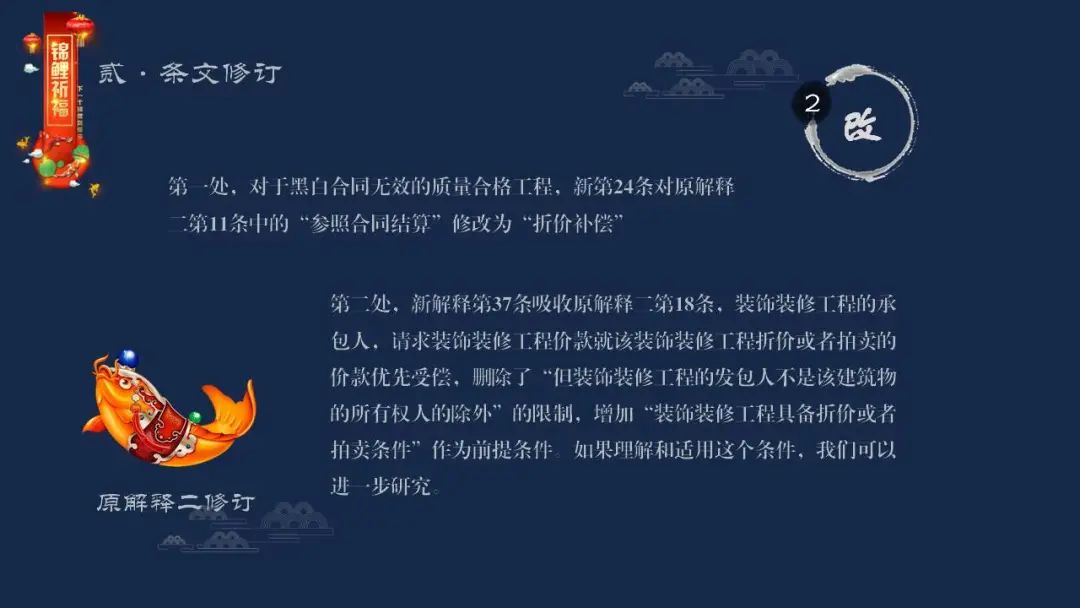 我将与大家分享几条锦鲤,看清条文变化背后不变的精神价值。我从此前建设工程审判实践和学习过程中提炼四条基本原则,根据为四讲。
