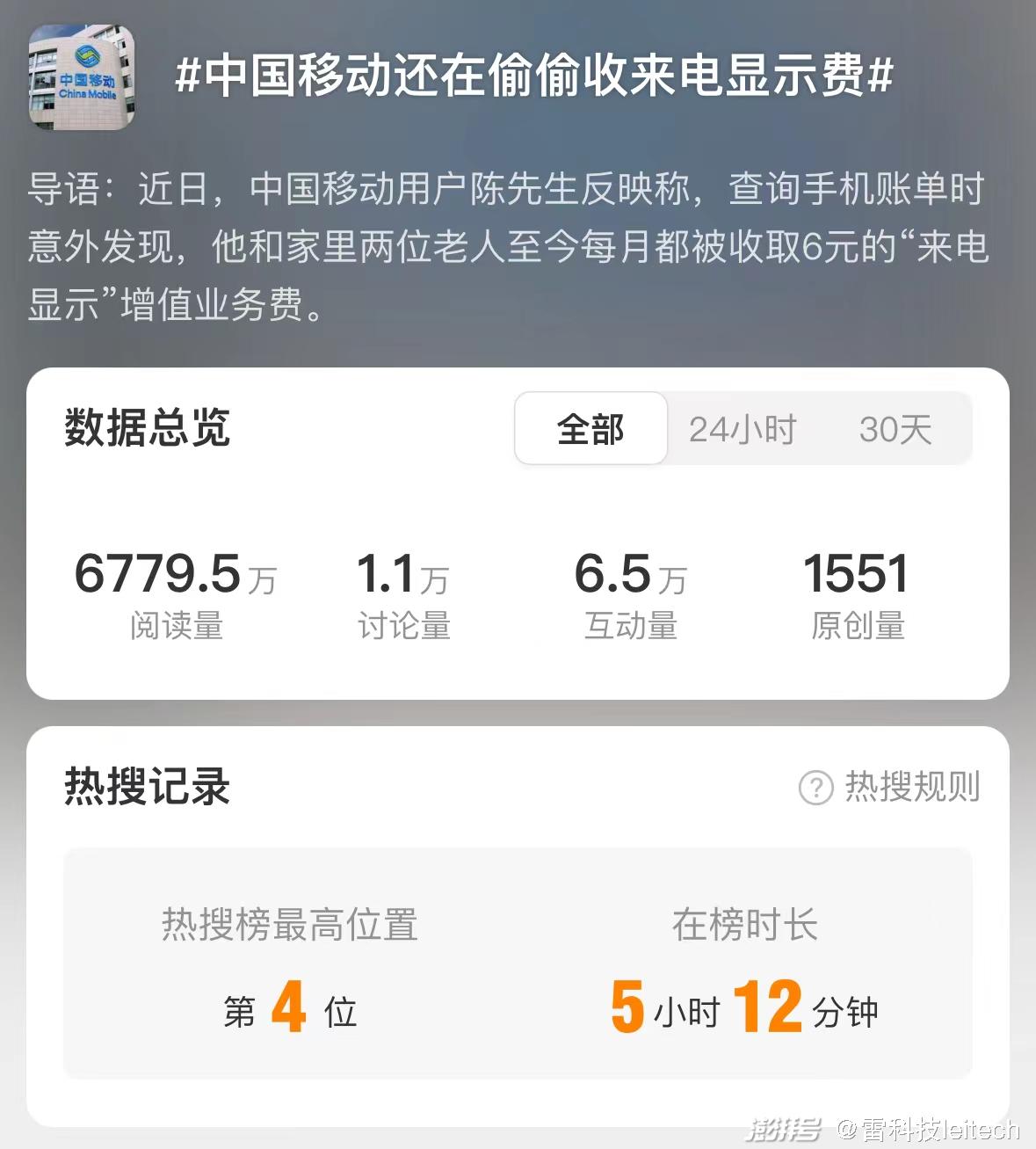 昨日,一个“中国移动还在偷偷收来电显示费”的话题冲上微博热搜,据小雷了解,这件事主要是关于中国移动在过去8年时间里一直收取该博主父母的来电显示费,按照每个月6元的费用计算,单个用户8年时间里累计收取了576元。之所以能够引起热烈讨论,主要是该博主表示向客服反馈后被告知无法退回相应费用,这才是舆论的焦点。