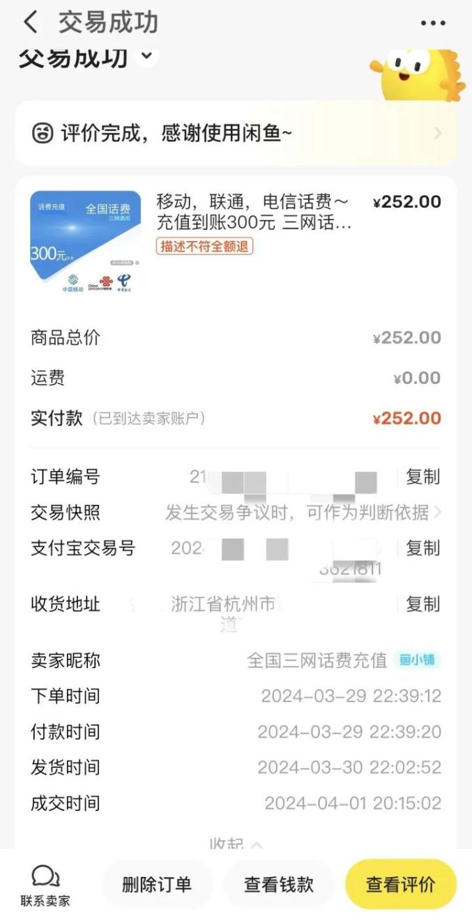 张先生当天下单后等了两天,在3月31日收到了充值成功的信息,于是他在平台点了“确认收货”。