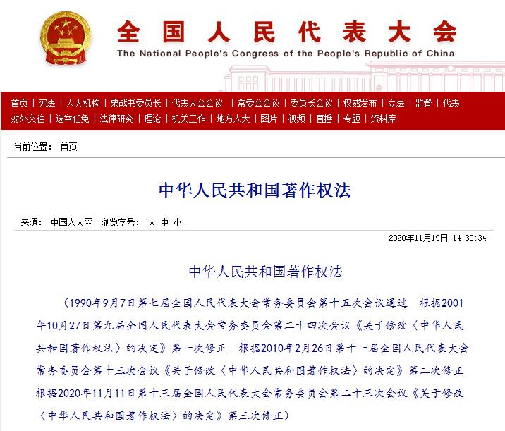 (1990年9月7日第七届全国人民代表大会常务委员会第十五次会议通过 根据2001年10月27日第九届全国人民代表大会常务委员会第二十四次会议《关于修改〈中华人民共和国著作权法〉的决定》第一次修正 根据2010年2月26日第十一届全国人民代表大会常务委员会第十三次会议《关于修改〈中华人民共和国著作权法〉的决定》第二次修正 根据2020年11月11日第十三届全国人民代表大会常务委员会第二十三次会议《关于修改〈中华人民共和国著作权法〉的决定》第三次修正)