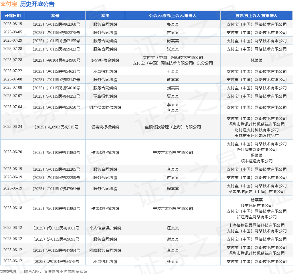 根据统计,近一年内以支付宝(中国)网络技术有限公司为当事人的历史开庭公告有323则,其中案由为“服务合同纠纷”的公告以144则居首,其次为“侵害作品信息网络传播权纠纷”有28则,“网络服务合同纠纷”有23则。历史开庭公告(前20条)如下:
