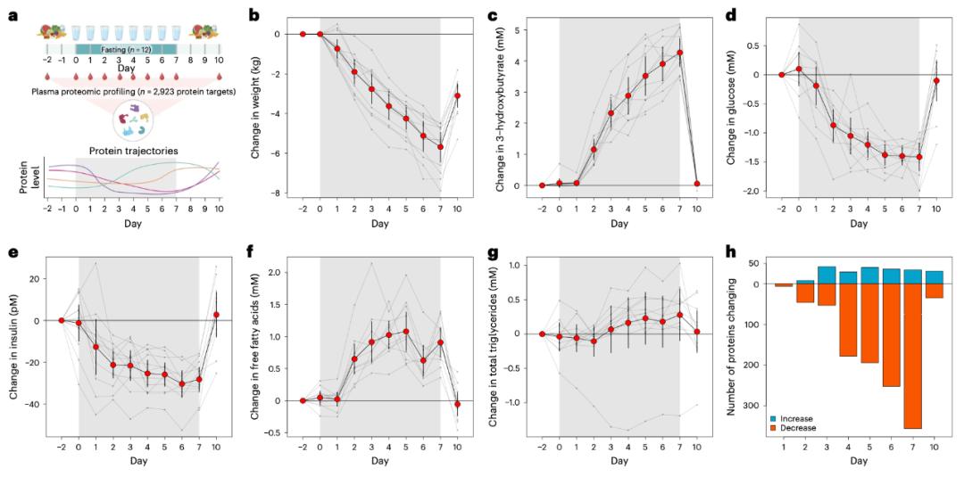 在这项研究中,研究团队跟踪了12名健康志愿者(5 名女性,7 名男性)参加为期七天的禁食(只喝水)。志愿者们每天都被密切监测,记录禁食前、禁食期间和禁食之后血液中约3000种蛋白质水平的变化。通过识别参与身体反应的蛋白质,研究团队可以整合大规模研究的基因信息,预测长期禁食可能带来的健康结果。