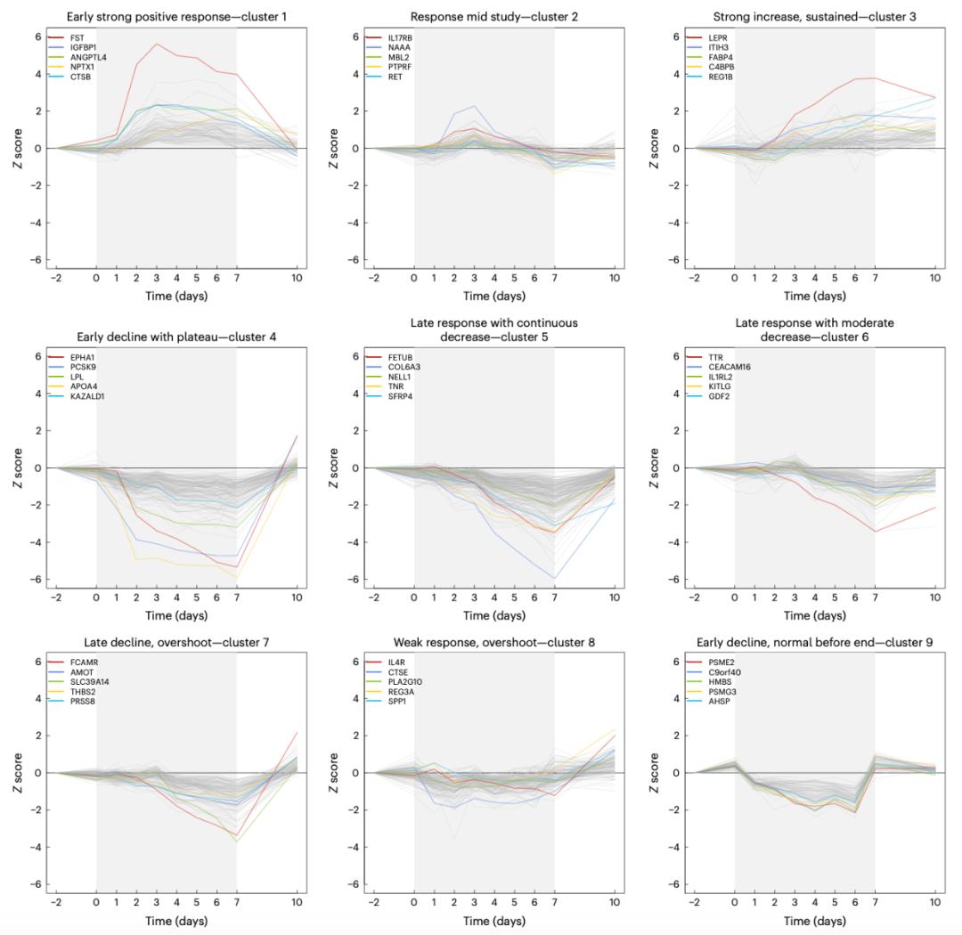 该研究首次观察到身体在禁食约三天后出现蛋白质水平的明显变化,表明了对完全热量限制的全身反应。总体而言,身体所有主要器官中测量的蛋白质(约3000种蛋白)中有三分之一(约1000种蛋白)在禁食期间发生了显著变化。这超过1000个显著变化的蛋白在志愿者中是一致的,但禁食也有一些独特的特征,超越了体重减轻,例如组成大脑神经元支持结构的细胞外基质蛋白tenascin-R的变化。