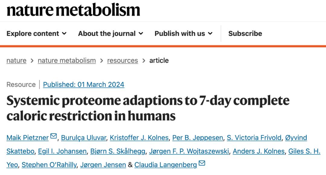 2024年3月1日,柏林夏里特医学院的研究人员在 Nature 子刊 Nature Metabolism 上发表了题为:Systemic proteome adaptions to 7-day complete caloric restriction in humans 的研究论文。