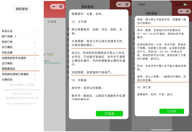 此外,据此前媒体报道,尽管协议规定“请在未禁摩和未限摩的区域出车”,但现实却是,许多摩的司机通过规避交通部门监管以躲避惩罚,而平台在实际运营中,跨区域接单等情况屡见不鲜。