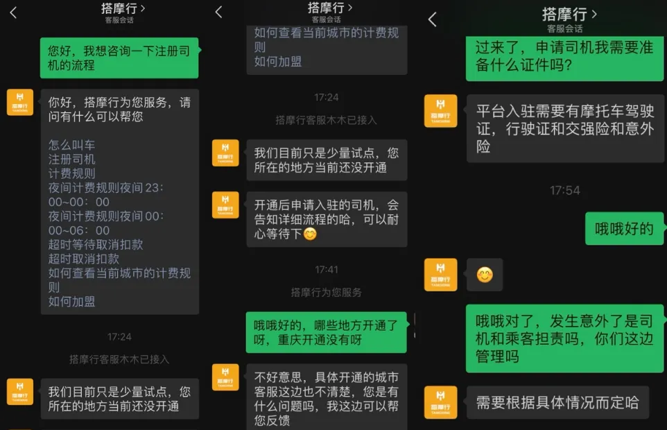 对于记者询问的“申请司机需要什么证件”,客服回复称,“入驻平台需要有摩托车驾驶证、行驶证、交强险和意外险。”