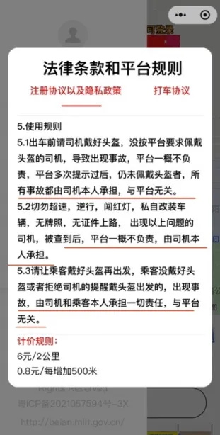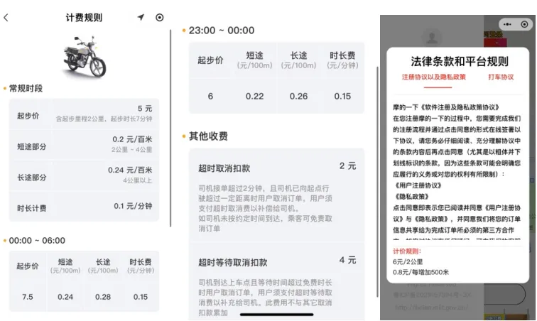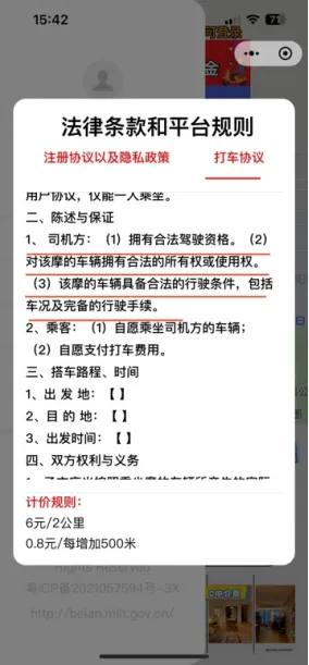 记者注意到,“搭摩行”和“摩的一下”两个平台,都有用户协议。“摩的一下”的协议相对更为详细,但仍有部分细则引起记者注意。