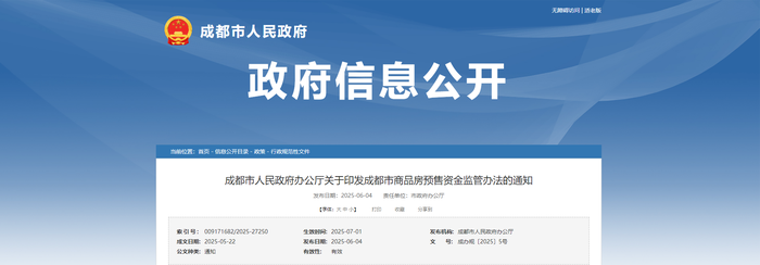 近日,《成都市商品房预售资金监管办法》(以下简称《办法》)正式印发。《办法》自2025年7月1日起施行,有效期5年。《办法》共计5章30条,包含总则、一般规定、预售资金的支取、监管措施、附则等内容。