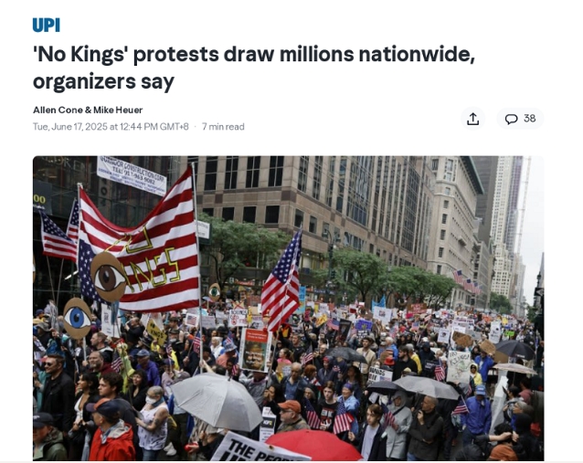 据美国合众国际社(UPI)6月17日报道,上个周末,全美多地爆发约2000场名为“不要国王”(No Kings)的抗议活动,组织者称参与人数达数百万。
