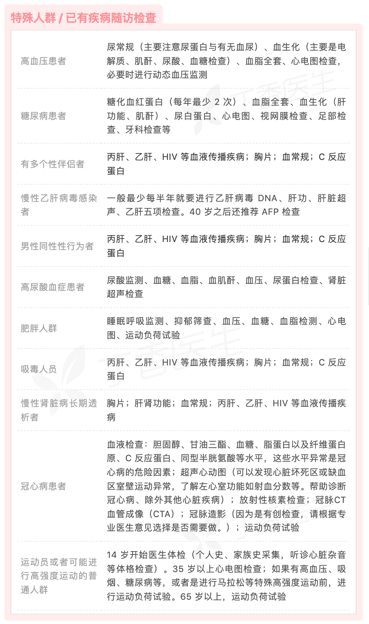 这部分的体检检查可能更为「量身定做」一些。不同基础疾病的人群相关危险因素确实存在不同,需要监测的指标也就不一样。