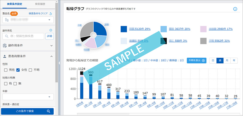 画面イメージ患者さんの年齢・性別・合併症などの条件に応じた、副作用の発現時期、転帰、処置、詳細な経過の確認が可能です。