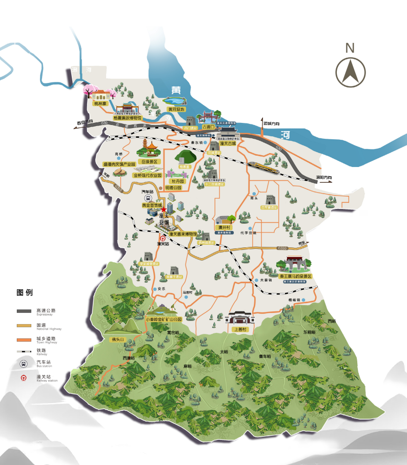 【旅游资源】自然旅游资源有:天下黄河第一弯、三河湿地风光、泉湖、佛头山等。人文旅游资源有:古潼关城墙、城楼遗址,李自成南原大战遗址,十二连城烽火台遗址,隋杨素墓遗址,唐李元谅墓遗址,秦王寨遗址,明代军寨遗址,水坡巷的唐古井、乾隆槐及明清民居等。名相故里和陵墓有:汉太尉杨震故里,父子阁老刘崎、刘宽故里(俗称“还牛堡”),汉太尉杨震墓。新建和恢复的人文旅游景区有:杨震廉政博物馆(杨震廉政教育基地)、神泉现代农业生态园、黄河湿地公园、古渡坊景区、岳渎公园、十里画廊栈道、岳渎牡丹园、潼关酱菜博物馆、马趵泉景区、上善村乡村旅游景区等。正在建设的旅游景区有:古城东山景区、小秦岭黄金矿山公园等。