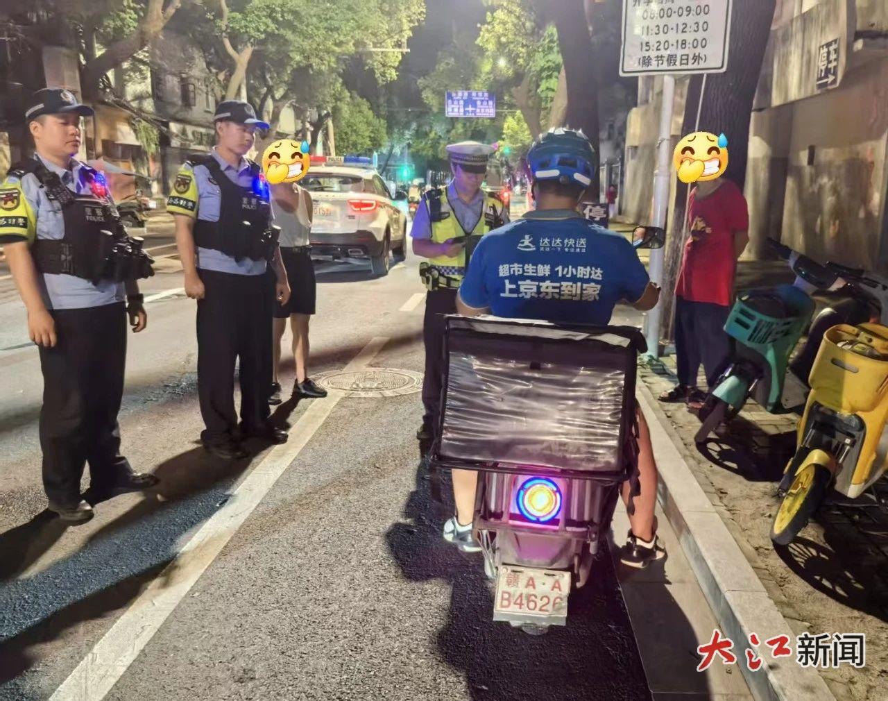 大江网/大江新闻客户端讯全媒体记者杨文超、实习生王霜报道:一些外送骑手为了方便夜间骑行,把电动车原有的车灯改装成强光灯,此举引来了很多行人的不满。为保障道路交通安全,南昌交警针对这类电动自行车非法加装强光灯乱象开展了专项整治行动,严厉查处改装、加装高强度照明灯等违法行为。