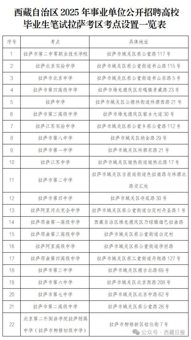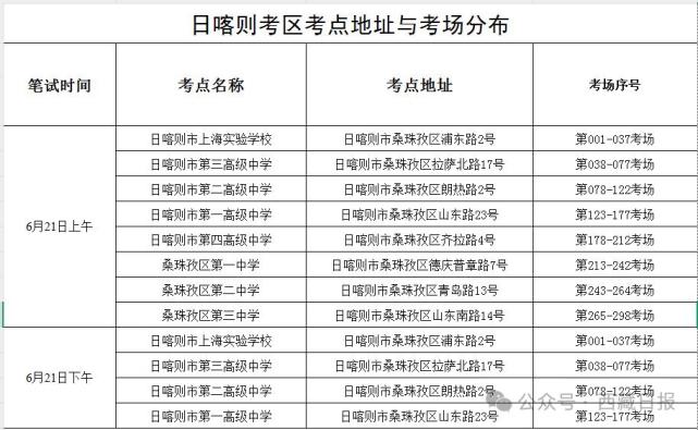 西藏自治区2025年事业单位公开招聘高校毕业生笔试于6月21日举行,为方便各位考生参加考试,现将日喀则考区考点信息公告如下,请各位考生提前合理规划行程,关注天气情况,按时顺利参加考试。