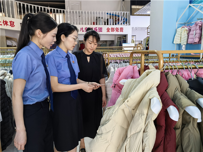 河南省光山县检察院检察官回访某服饰有限公司,了解产品标识完善情况。