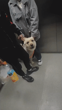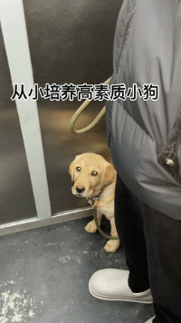大金毛看到有小朋友上电梯,赶紧把头藏在主人裤裆下面,生怕吓到人家。