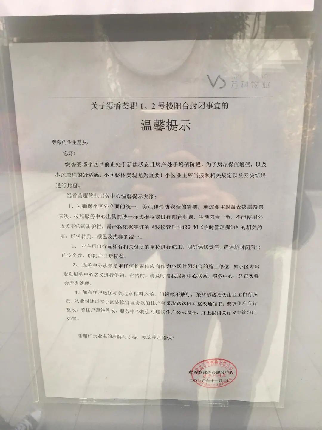 在小区进门的告示栏上有一张《关于缇香荟郡1、2号楼阳台封闭事宜的温馨提示》。其中第一条为:
