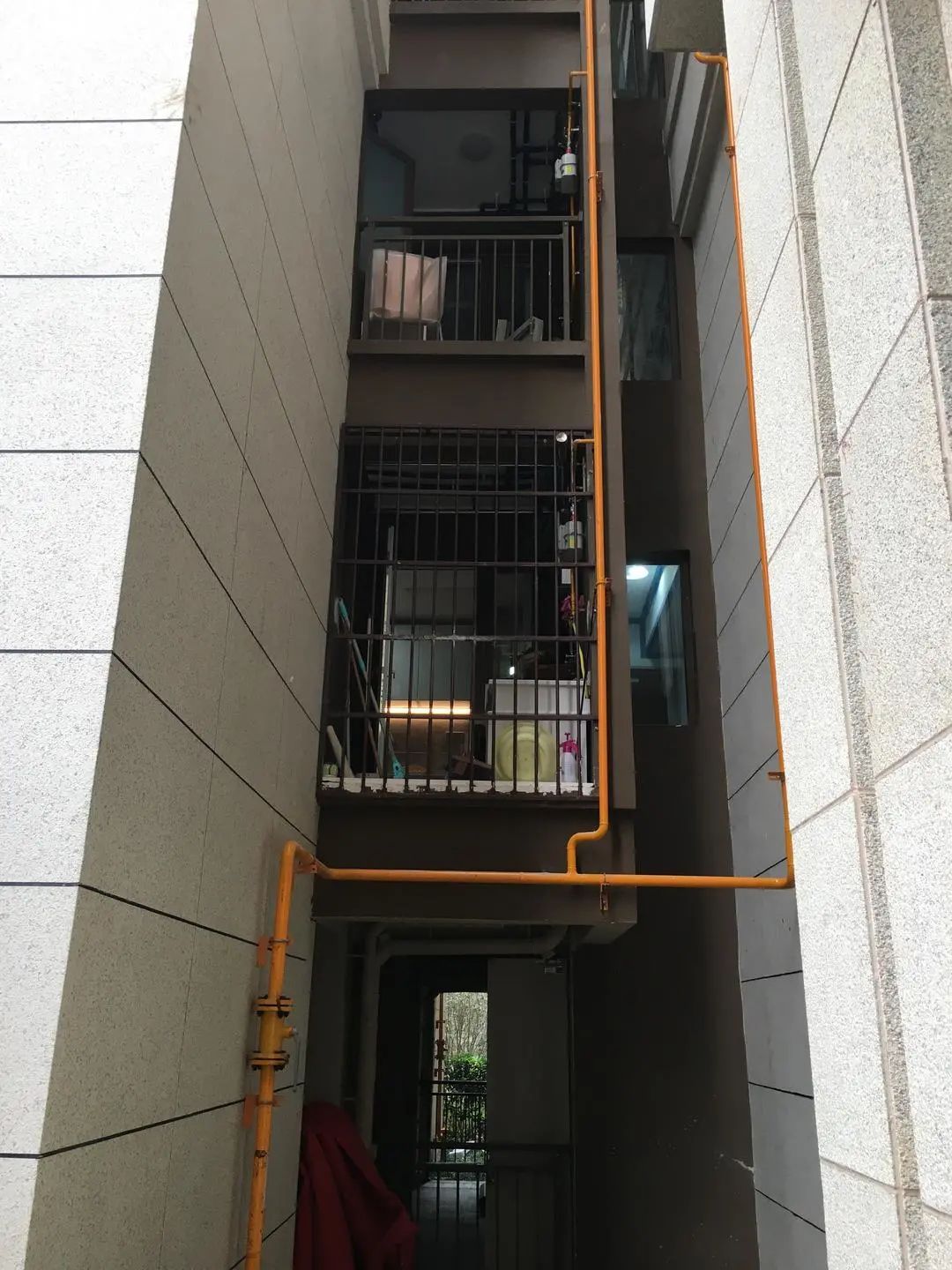政事君现场看到,符合标准的防护栏应紧贴墙面,位于墙面和黄色的燃气管道之间。防护栏的颜色和墙体一致,都是深咖啡色。“遵守约定的业主看到肯定会问,更担心的是其他还没装的业主会效仿。”物业工作人员表示,外凸式防护栏大约两米高,五六十厘米宽。