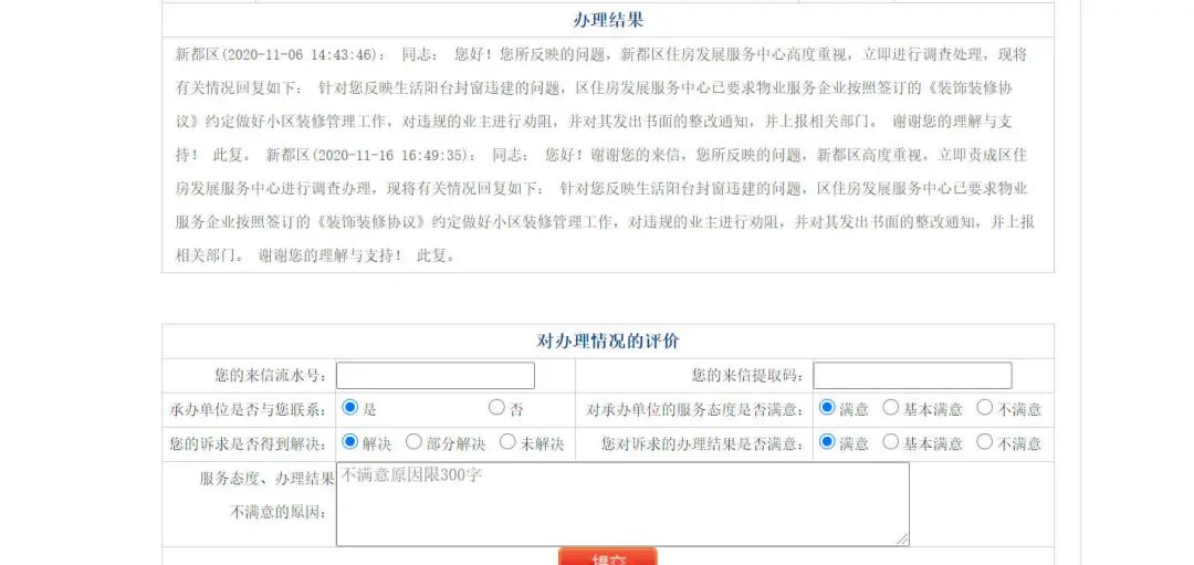 然后事情并没有结束。11月11日,成都市网络理政办再次整理工单交由新都区。部门签收和退回情况和之前一致。11月13日19点40分,新都区审核新都区住房发展服务中心延期申请(通过)。关于目前的最新进展,11月16日的办理结果回复为: